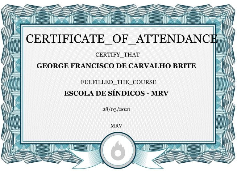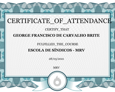 Dentre vários treinamentos que realizei tenho o certificado pela Escolas de Síndicos da MRV onde pude aprender as diferenças entre uma empresa e um condomínio e como servir melhor atuando como síndico.